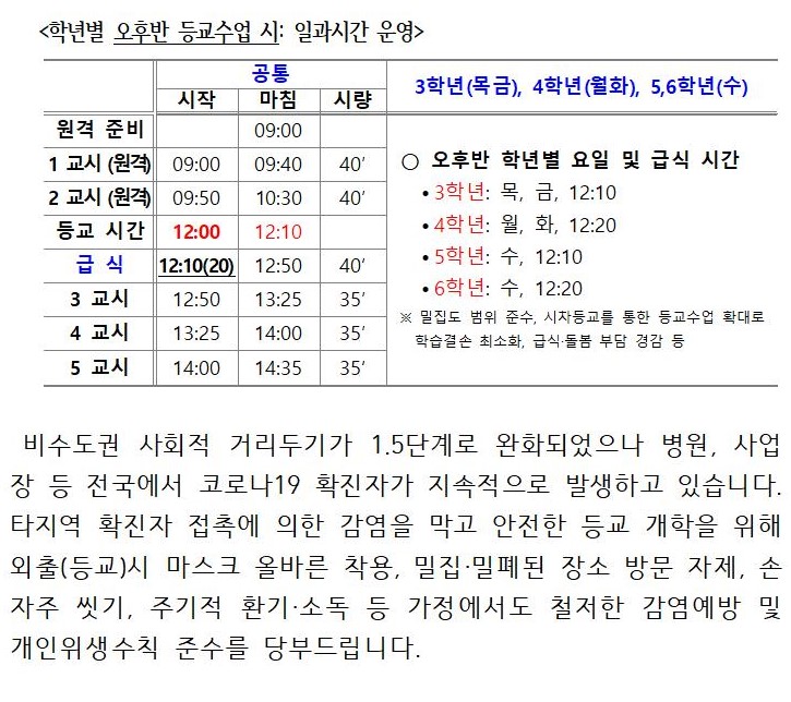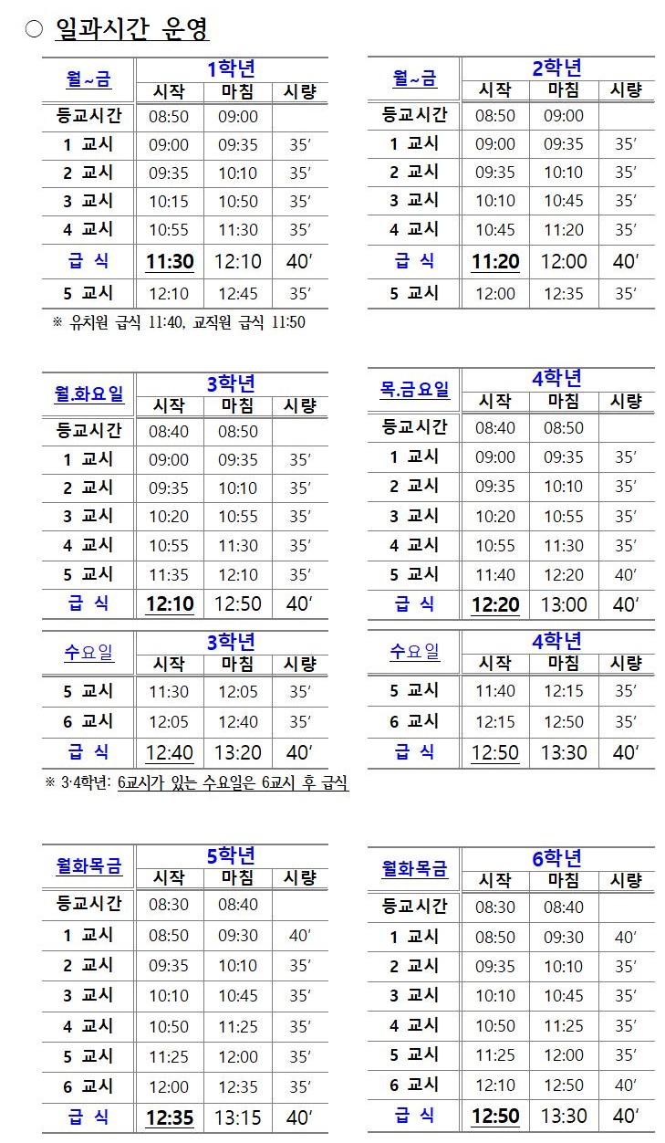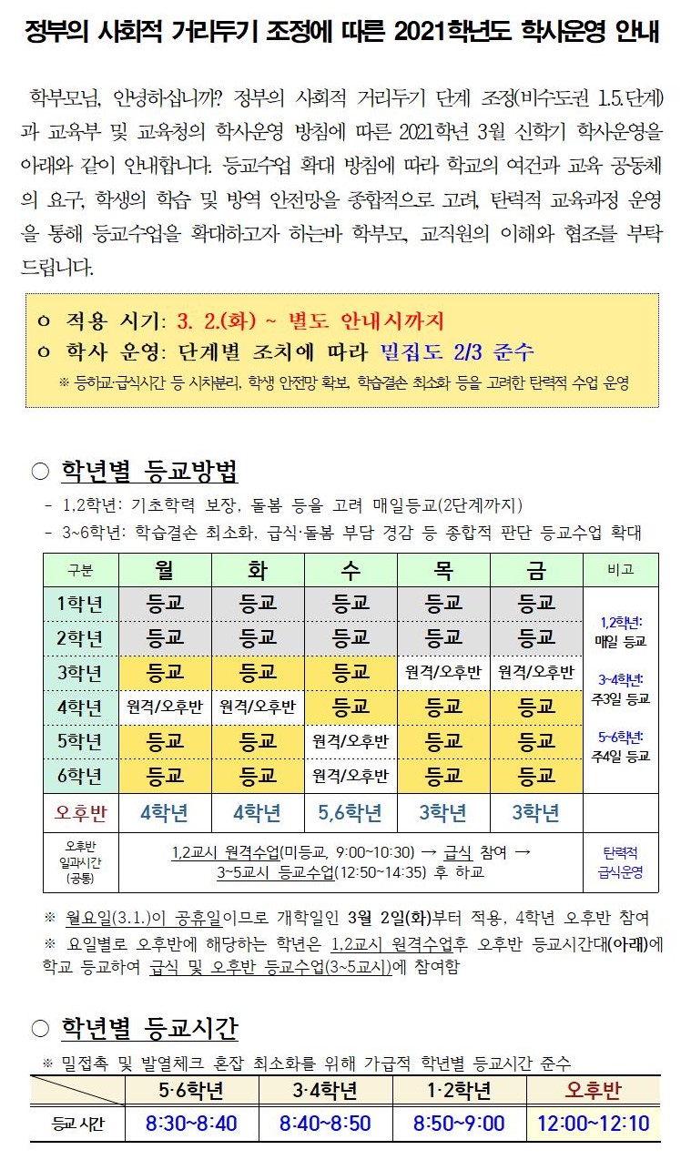 2021학년도 학사운영 안내(학년별 요일 표시)