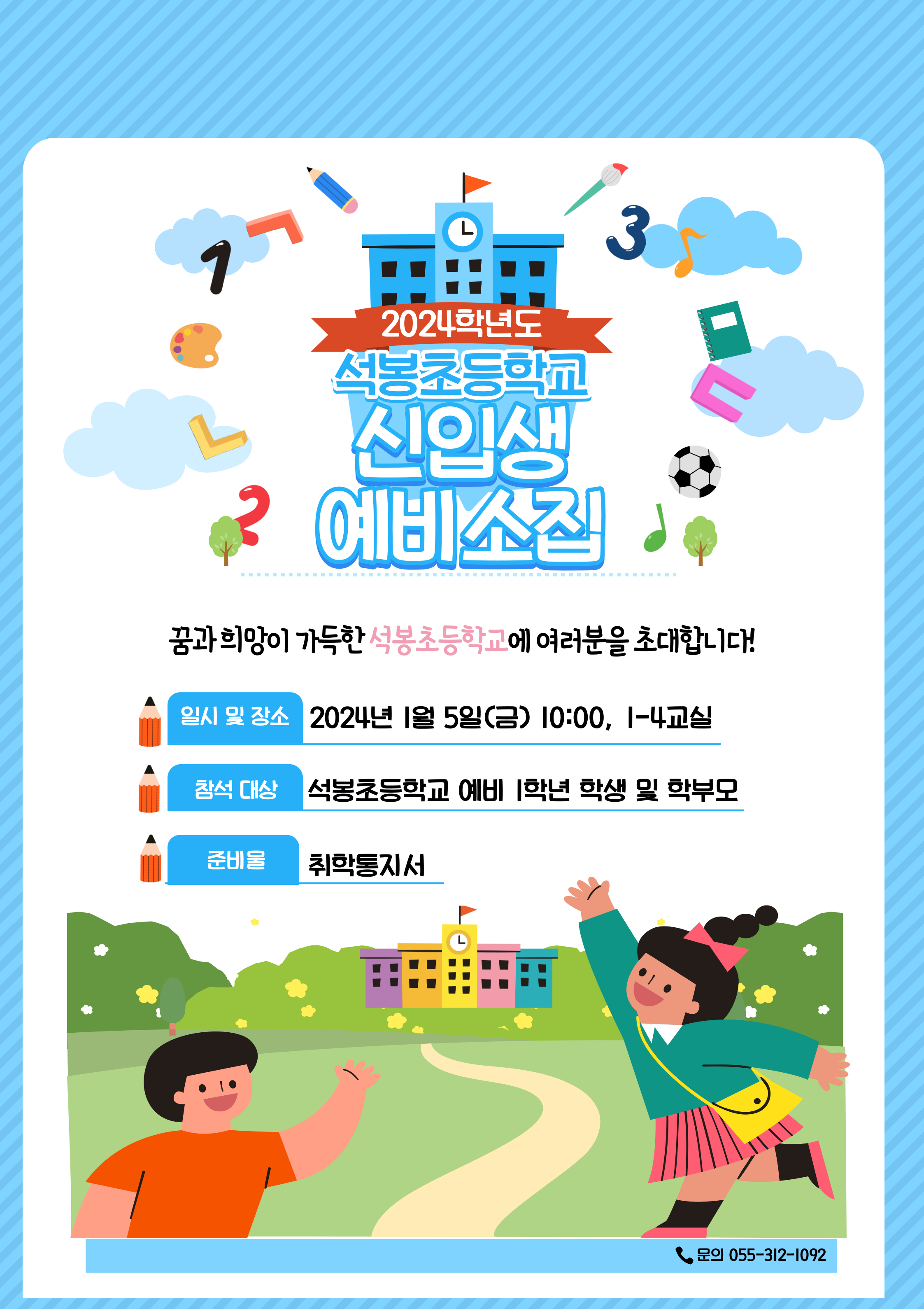 2024학년도 석봉초 신입생 예비소집 안내 1. 일시 및 장소 가. 일시: 2024. 1. 5.(금) 10:00~ 나. 장소: 석봉초 1학년 4반 교실 ※ 석봉초등학교 1학년 현관을 이용하여 손 소독 후 입실 당부드립니다. 2. 대상 - 동사무소에서 취학통지서를 배부받은 아동과 학부모 1인 (부득이하게 취학 대상 아동을 동행하지 못하실 경우 화상통화나 재원 증명서로 확인 가능) 3. 지참 서류 - 취학통지서(통지서 안의 개인정보 동의, 보호자 연락처 반드시 기재) 4. (필수) 반 편성 기초자료(2가지 중 한 가지 선택) - [방법1] 첨부파일(아동이해자료) 작성하여 예비소집일에 제출하는 방법(권장) - [방법2] 예비소집일에 서류를 받아 현장에서 작성 제출하는 방법 5. 참고사항 - 입학할 아동과 학부모 한 분만 입장이 가능합니다. - 예비소집일에 참여할 수 없는 학부모님께서는 석봉초 교무실(055-312-1092)로 반드시 사전 연락 바랍니다. 2023. 12. 26. 석 봉 초 등 학 교 장